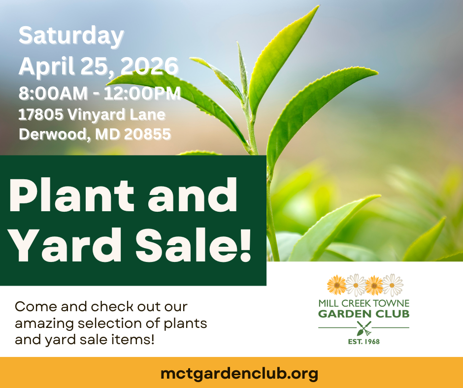 Please help support the Mill Creek Towne Garden Club by participating in our Spring Plant & Yard Sale. Proceeds from sales and donations will help defray the costs for landscaping and maintenance of Mill Creek Towne’s main entrances and garden-related educational programs for the Derwood community! Thank you for all your help and contributions!
