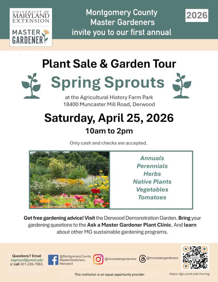 Happy Spring! Here are some garden tips, educational opportunities, and videos for April. Some upcoming events/resources include MCT Garden Club Mill Creek Extreme Cleanup, Saturday, April 18, Mill Creek Towne Garden Club Plant & Yard Sale – Sat. April 25, HGIC Backyard Gardening Zoom Sessions, Natives at Noon: Lunch & Learn Webinar Series, Montgomery County Master Gardener Plant Sale and Garden Tour @ Agricultural History Farm Park, Montgomery Parks – Events: Hiking Histories @ Agricultural History Farm Park, Black Hill Discovery Center: Eagle Nest Engineering, Birding for Beginners, Beaver Day Celebration, Make It & Take – Feeling Froggy, Garden Day, Wild Child Hike, Campfires at Black Hill, Black Hill Van Trips – Blandy Experimental Farm, Storytime on the Lake, Brookside Gardens:  Transform Your Garden: Brookside’s Native Plant & Design Lectures, Croydon Creek Nature Center‘s Native Plant Sale, Locust Grove Nature Center: Spring Native Plant Sale at Pope Farm Nursery, Gaithersburg, MD; Seneca Creek State Park April Programs; Montgomery College: Environmental Horticulture Program – Spring 2026 classes, Lifelong Learning Home and Garden Classes – Spring 2026, and more! A lot of gardening events are announced on Facebook as well as on our website. These events will be hosted as online or in-person events.